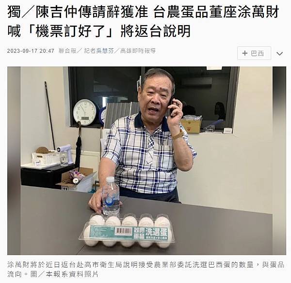 獨/陳吉仲傳請辭獲准 台農蛋品董座涂萬財喊「機票訂好了」將返台說明