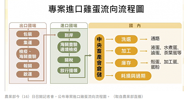 農業部今(16)日召開記者會,公布專案進口雞蛋流向流程圖。 (取自農業部直播)