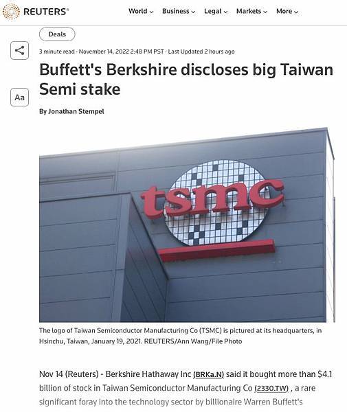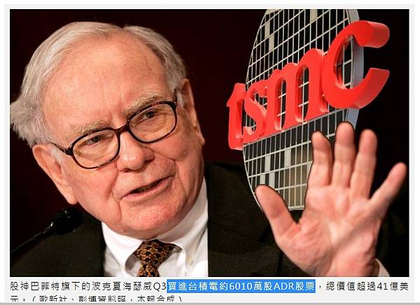 國億萬富豪巴菲特旗下的波克夏海瑟威公司(Berkshire Hathaway)今天披露,已買進價值超過41億美元的台積電股票;這是巴菲特的企業集團對科技領域罕見的一次重大投資。