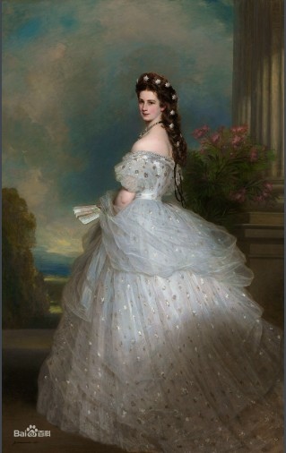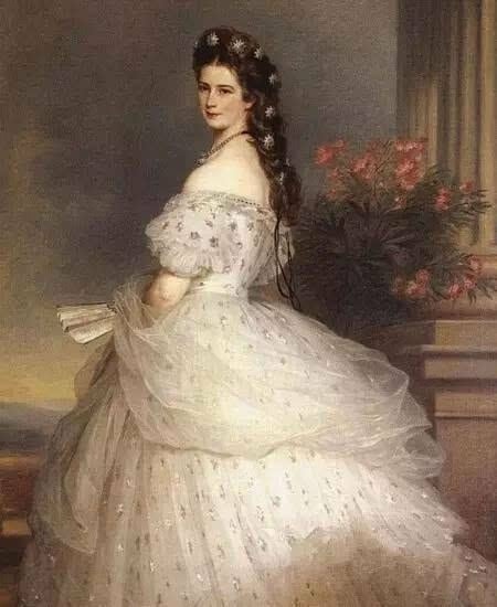茜茜的美貌在19世紀60年代登峯造極 [18] 。1864年,茜茜前往德累斯頓參加弟弟卡爾·特奧多爾的婚禮 [18] 。人們形容她“光彩照人”,薩克森王后稱讚她“美貌絕倫” [18] 。她穿着帶星星圖案的白色克里諾林裙,編織的髮辮上點綴着鑽石星花的形象被當時著名的畫家弗朗茲·克薩韋爾·温特哈爾特描繪在畫布上,成為她最經典的形象,在一百多年的歷史中被無數人所模仿 [18] 。1864年,美國駐維也納公使在一封給母親的信中寫道 [18] :“皇后是個美的奇蹟——挺拔苗條,絕美的身段,豐茂的淺褐色的頭髮,低矮的希臘式的額頭,温柔的眼睛,紅色的嘴唇帶着甜美的微笑,輕微美妙的聲音,靦腆但十分優雅的舉止。” [18]