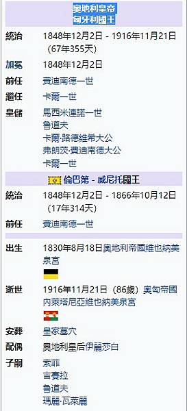 1867年6月8日,他與匈牙利貴族達成和解,加冕為匈牙利國王,戴上聖斯蒂芬王冠,建立了奧匈帝國。二弟奧地利大公兼墨西哥皇帝馬西米連諾在6月19日被墨西哥革命黨槍斃,沒留下任何子女。