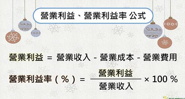 營業費用包括租金、水電、薪資、行銷費用等,這些都是間接成本,營業利益率(簡稱營益率)越高,代表企業經營管理的能力越好,是本業獲利能力的指標。若營利率為負數,表示公司的營運有困難。