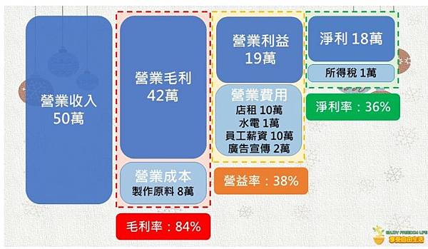 最後所得稅的費用平均每個月需要支付1萬元。了解了這些費用支出流向後,我們就可以知道這家店的毛利率、營業利益率、及淨利率(稅後)的結果是如何了。