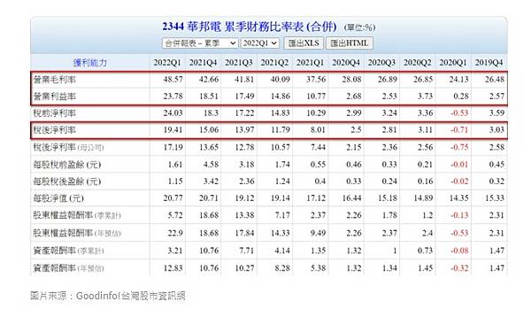 接下來就介紹一個查資料的平台給大家參考,「Goodinfo!台灣股市資訊網」可以查到財報相關資料,包含獲利能力的相關指標,而下列是以華邦電(2344)為例,可以明顯看出2022年Q1的毛利率、營業利益率、稅後淨利率同步優於去年同期2021年Q1及2022年Q4,標準的三率三升範本,但仍然要提醒一下,財報屬於的是過去的資訊,投資人除了以財報做為投資標的判斷依據外,仍應以整體產業展望進行綜觀考量 「三率三升」是指哪三率? @ 黃大偉理財研究室 :: 痞客邦 ::