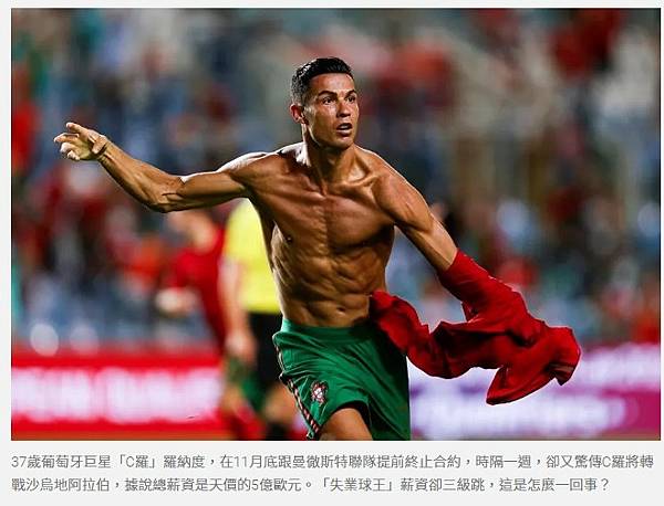 37歲葡萄牙巨星「C羅」羅納度,在11月底跟曼徹斯特聯隊提前終止合約,時隔一週,卻又驚傳C羅將轉戰沙烏地阿拉伯,據說總薪資是天價的5億歐元。「失業球王」薪資卻三級跳,這是怎麼一回事?