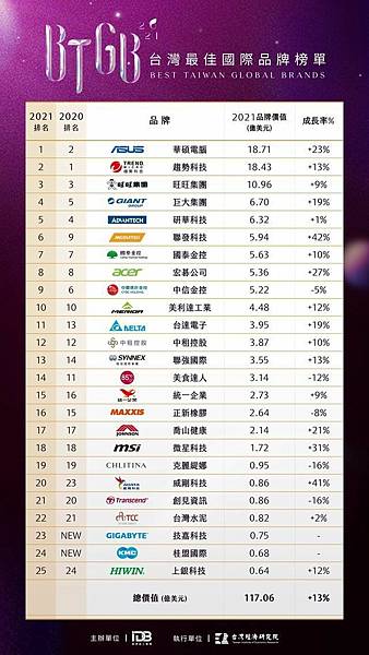 -經濟部工業局自 2020 年起也啟動台灣品牌耀飛計畫,擴大表揚台灣前 25 名國際品牌價值企業,累計今年前 25 大企業創造 131.22 億美元價值、年增 12%,為連續 3 年超過百億元價值,其中,科技、電子消費品牌價值總體上升幅度優於平均,分別年增 21%、16%。
