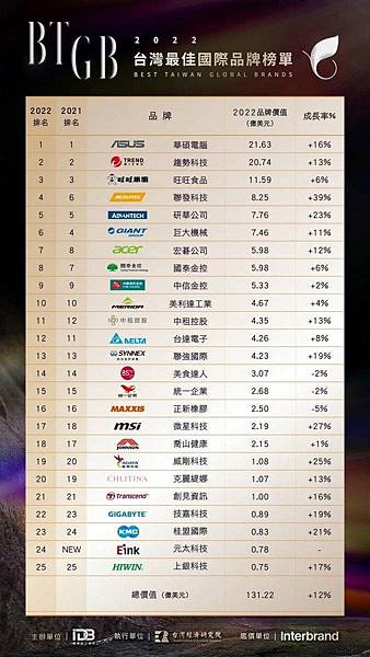 經濟部工業局今 (22) 日與台灣經濟研究院、品牌價值調查機構 Interbrand 共同揭曉 2022 年台灣國際品牌價值調查,並公布今年前 25 大品牌,其中,華碩 (2357-TW) 品牌價值達 21.63 億美元、年增 16%,蟬聯冠軍寶座,趨勢科技、旺旺集團則分居 2、3 名,此外,電子紙大廠元太 (8069-TW) 也首度擠進前 25 大品牌中。