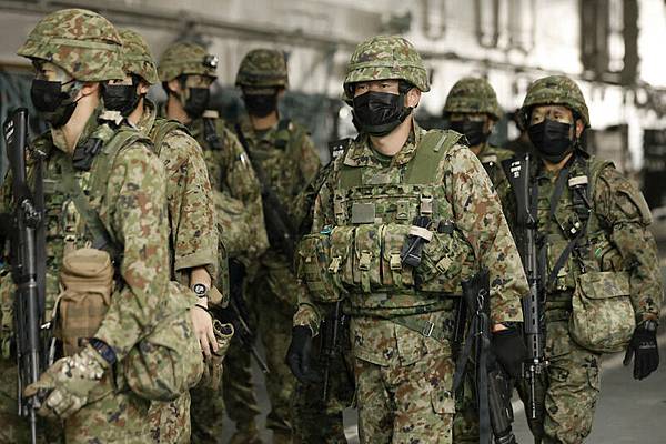 日本公益財團法人「新聞通信調查會」近日發布調查結果,指出近8成日本受訪者對台海爆發衝突感到有危機感,但如果中國武力犯台,超過7成受訪者反對出動自衛隊協防。圖為日本自衛隊示意圖。(彭博)