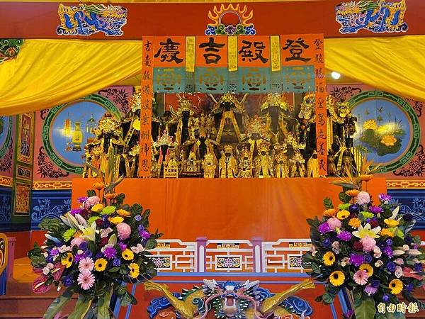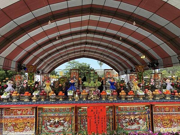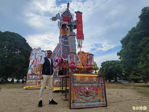 府城六合境馬公廟建醮,普度場設置4層樓高巨型大士爺,規模之大令人嘆為觀止。(記者王姝琇攝)