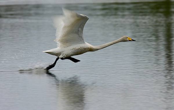 天鵝的飛行甚是有趣,起飛宛若飛機,有著航道與順序;前一批天鵝起飛後,下一批天鵝則由旁側的跑道進入飛行航道準備,因為體積龐大,需九撲十八拍一段距離後,方能躍上天際。