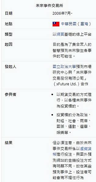 未來事件交易所是一個以網頁基礎的線上平台,目的是為了集合眾人的智慧預測未來發生各事件的可能性。網站由國立政治大學預測市場研究中心與「未來事件交易股份有限公司」(xFuture Ltd.)合作,網路資源由未來事件交易公司提供,該公司由中華民國國家科學及技術委員會及國立政治大學持有部分股份。