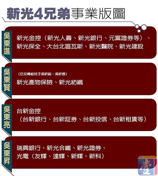 四房吳東昇之前一直在讀書,從政,後來在母親支持下重回集團任職,但是幾個兄長不好對付,老四現在是新光合成纖維董事長,身家不如哥哥們豐厚。