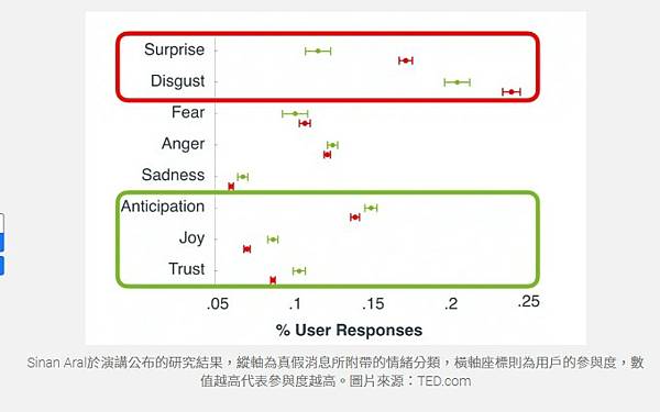Aral的團隊接續分析不同真/假消息的互動、參與,在針對不同情緒的統計上,如:信任、喜樂、期待、難過、憤怒、害怕、噁心、驚喜,發現在「噁心、驚喜」的構面上,假消息的互動(回覆)比真消息還要高得多(上圖紅色框框所示),接續下來的則是「期待、憤怒、害怕」,真假消息的互動皆差不多。從Aral的研究可以發現,相比於正面情緒(信任、喜樂)置入負面情緒的內容(噁心、憤怒、害怕),Twitter的使用者互動率反而比較高。