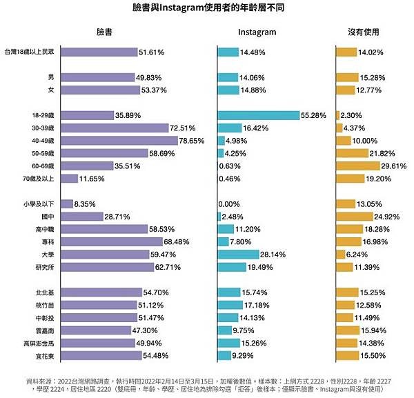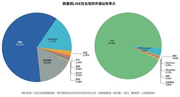 社群平台與即時通訊軟體的「主要使用」的市場獨佔情形則與海外相似。上網者中臉書的市占率高達 61.22%、LINE 市占率更高達 94.48%。調查也顯示年輕人離開臉書、轉向 Instagram 的社群遷徙現象。