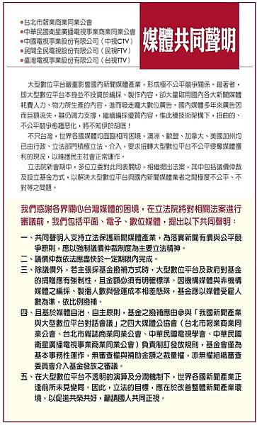 我們感謝各界關心台灣媒體的困境,在立法院將對相關法案進行審議前,我們包括平面、電子、數位媒體,提出以下共同聲明: