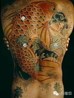 11.鯉魚:男性活力、反抗精神和頑強不屈的象徵,神話中鯉魚也被看作是一種神聖的魚。日式刺青里,鯉魚可以給他的主人帶來健康長壽,預示著多子多福。