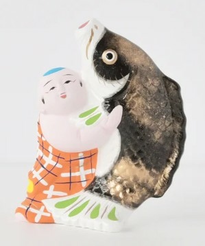 小孩和鯉魚都豐滿,表情可愛。祈願孩子健康成長。
