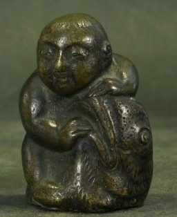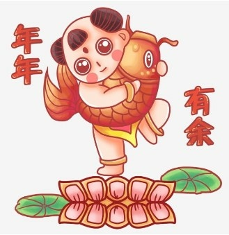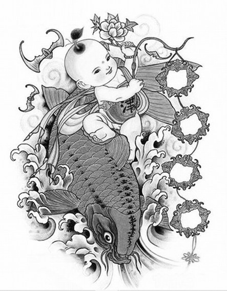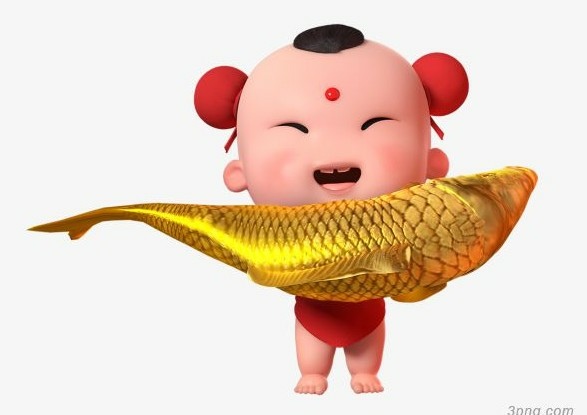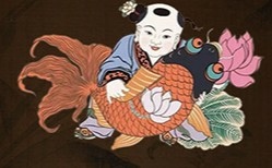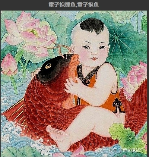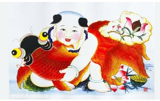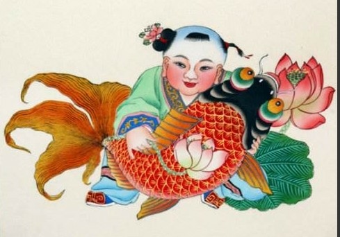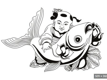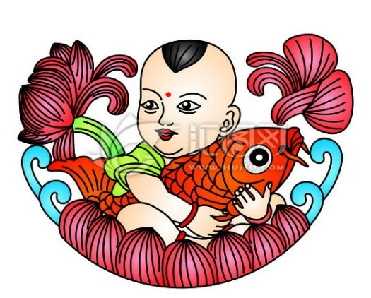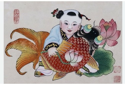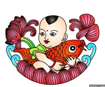 拿著鯉魚的孩子。還有龍門傳說:“黃河上游,鯉魚渡龍門急流,化龍騰空。”鯉魚是吉祥物。
