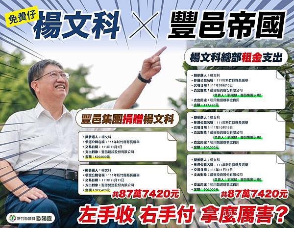 也就是說楊縣長是付了豐邑租金沒錯,但豐邑又回捐回來,等於無償使用了豐邑接待中心當總部,樂當了三個月免費仔,而豐邑集團所捐的政治獻金還能幫企業抵稅!雙方達成雙贏,共存共榮好不快樂🤭