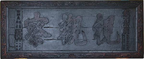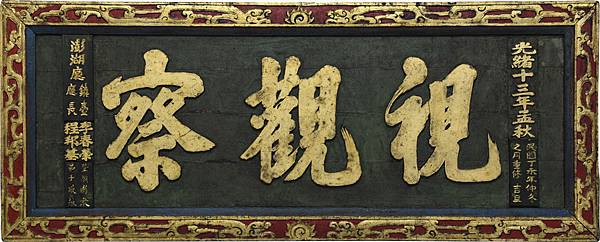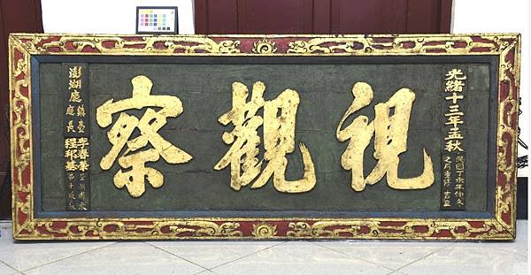 圖片為本團隊成員江昭蓉於2019年12月10日所拍攝,為文澳城隍廟「視觀察」匾額,此匾立於光緒年間。此匾據《硓古石》季刊第41期,篇名為「澎湖文澳城隍廟及媽宮城隍廟史蹟考證」作者吳培基於此文章中說明,上款:「光緒十三年孟秋」,下方註記「民國丁未年仲冬之月重修 吉旦」;下款:「澎湖廳鎮臺李春榮、廳長程邦基」,下方註記「暨閤澎眾弟子敬献」。孟秋為7月,民國丁未年仲冬為民國56年農曆11月,「献」是「獻」的俗字 視觀察匾