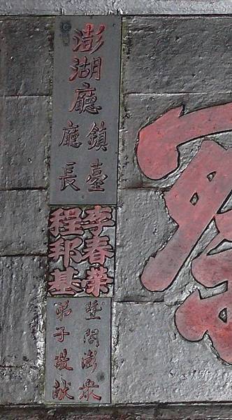 有趣的是,匾額上下款「澎湖廳鎮臺廳長」、「暨閤澎眾弟子敬?(獻)」,應該都是56年城隍廟重修時,另以木片刻字固定於匾上;據「澎湖廳志」記載,程邦基、李春榮為前後任澎湖廳通判,所以「鎮臺」和「廳長」之官銜,應是56年重修時誤寫。