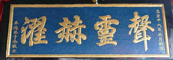 匾詞:聲靈赫濯。上款:嘉慶甲戌年花月穀旦。下款:本境弟子仝敬立。解釋:一般農曆二月稱花月。古時候將二月二日定為「花朝」,也名「撲蝶節」,熱烈慶祝「百花生日」。穀旦表示良辰吉時之意。