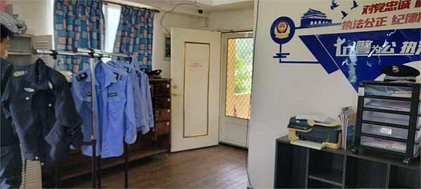 花蓮壽豐鄉一家民宿被查獲詐騙機房,還發現房間內有中國公安制服、牆上甚至有公安局的標語裝飾,藉此和中國網友視訊取信對方匯款。(調查局提供)
