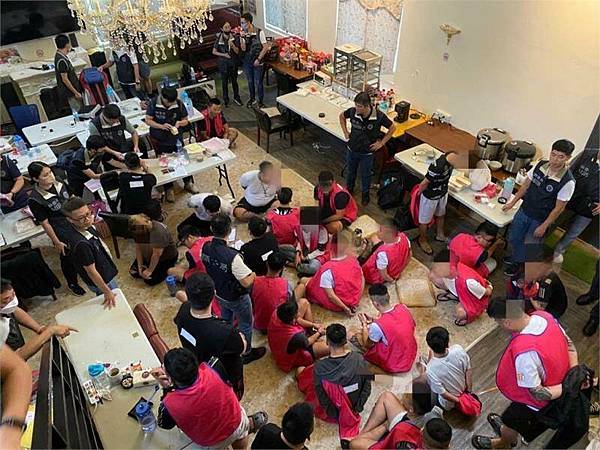 花蓮壽豐鄉一家民宿被查獲詐騙機房,檢警大動作搜索,整個民宿大廳都是詐騙成員。(調查局提供)