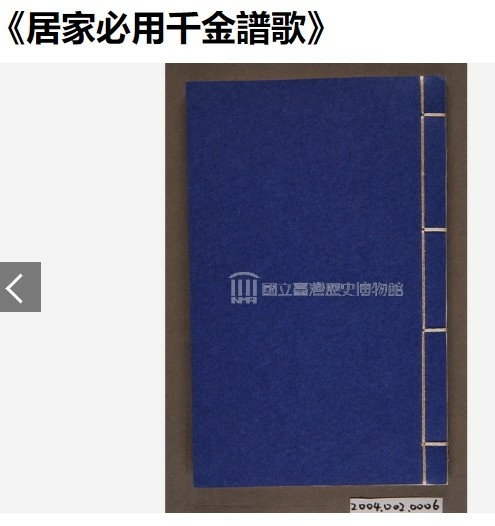 本文物為線裝書,藍皮紙面,正反無文字。內頁印有《居家必用千金譜歌》,為咸豐壬子(1852)冬月印。《千金譜》,又名《居家必備千金譜》,為曾流傳於閩南、台灣的閩南語蒙學書籍。文句押韻,用閩南語朗誦。其內容多為與日常生活事物,作為識字基礎教材,作為家庭教育的教材。昔日台灣俗諺:「字是隨身寶,財是國家珍,一字值千金,千金難買聖賢心。」即出自此書。《居家必用千金譜歌》-文化部國家文化記憶庫 https://bit.ly/3uWb0Uc