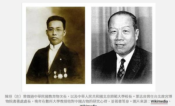 陳垣(左)曾做過中華民國教育物次長,以及中華人民共和國北京師範大學校長。那志良曾任台北故宮博物院書畫處處長,晚年在數所大學教授他對中國古物的研究心得,並著書等身。圖片來源:Wikimedia、Wikimedia