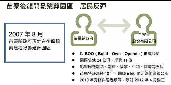 苗栗縣政府以縣民沒有一處一貫作業制的殯葬園區,民眾只能在路邊搭棚辦葬事對過往者十分不敬為由,與全安泰股份有限公司以BOO(Build-Own-Operate業者興建、擁有、營運)方式,聯手開發「福祿壽殯葬園區」。只是,殯葬園區就在主要道路旁,緊鄰國小、加油站以及聚落,收費又高於一般收費,居民到底能受惠嗎?居民與民代都搖頭,苗栗不需要多一處殯葬園區。