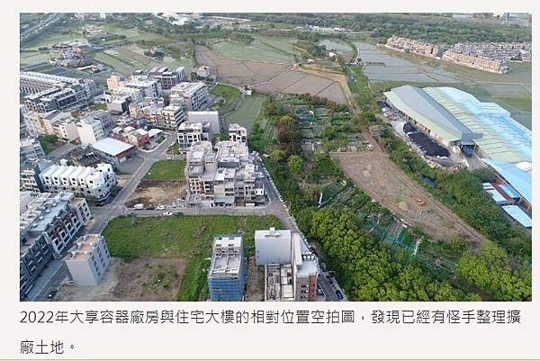 2022年大享容器廠房與住宅大樓的相對位置空拍圖,發現已經有怪手整理擴廠土地。