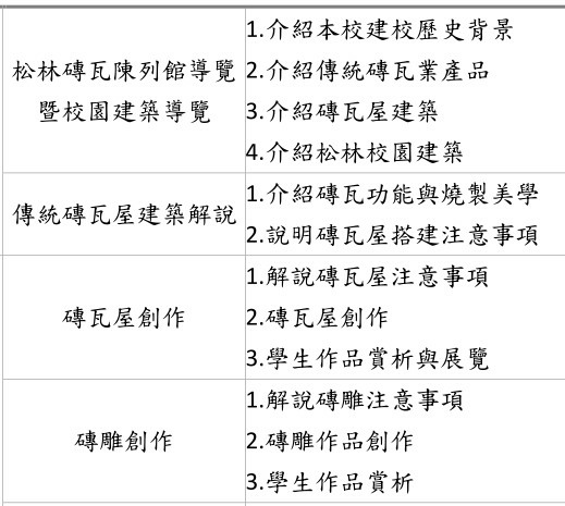本課程設計以跨領域連結藝術與人文、社會、資訊學習課程,從穿越時空,帶領學生興起磚瓦歷史懷古之情,將情感帶入藝術學習與作品創作,透過藝術的基本技法、原理的學習,創作出的作品不只是作品呈現,而是揉進對家鄉歷史的理解及對校園的認同。