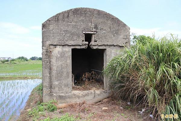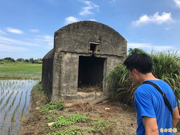 圖左的日軍水塔遺跡位於新豐後湖村精華國中附近的梁家土地上。(記者黃美珠攝)