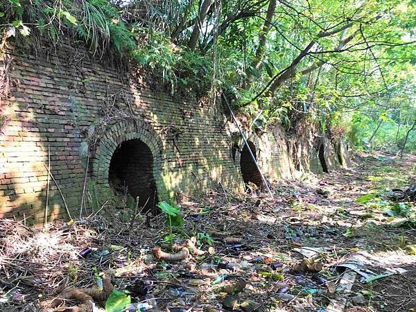 二、永基磚廠:外型結構原為八卦窯構造,與協和磚廠相同,窯外有設一煙囪以作為與窯內煙道設計流通,外觀窯體僅存單一面牆,理應單一面有八個窯口,現有僅存6個窯口,窯面之頭尾兩端已遭土方所掩蓋,窯體上方佈滿大樹及樹根穿透窯體表面,研判窯頂應已受上方土石壓重及樹根擠壓而塌陷損毀。