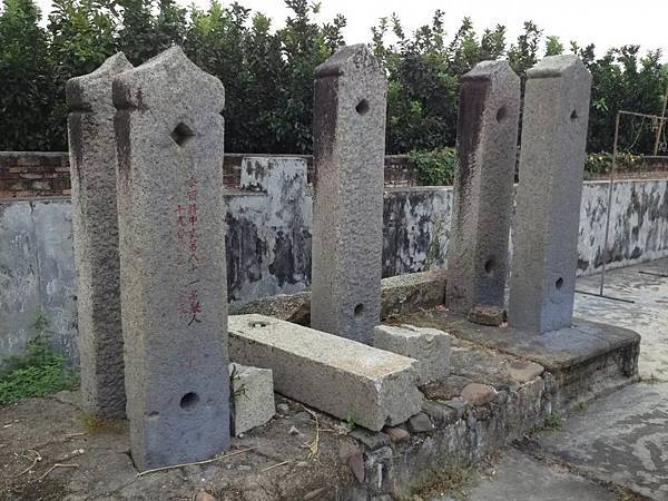步出禾埕,圓形矮牆外在南北豎立了兩支有斗的旗杆。古代秀才若能出貢或考取舉人、進士,即有資格「豎旗立匾」;而朱元璋當上皇帝後,要求旗杆上要有旗斗,在斗內裝稻穀餵食雀鳥,以感念雀鳥在他貧困歲月中的餵穀之恩。到了清朝,旗杆上的旗斗演變成感念皇帝恩賜,方型旗斗代表在朝為官。
