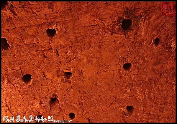 窯室內跨距很大的圓拱幅度,是造窯體匠師的砌磚技術精隨,弧線表面有規律排列的投煤炭孔,也是顧窯火師傅觀看燒磚成色的孔洞,窯洞中層層疊疊的紅磚排列,只靠疊砌工夫而成,令人讚嘆!