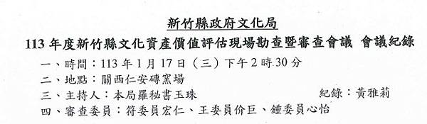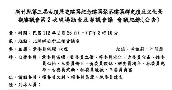 新竹縣第三屆古蹟歷史建築紀念建築聚落建築群史蹟及文化景觀審議會第2次現場勘查及審議會議 會議紀錄 - 新竹縣政府文化局