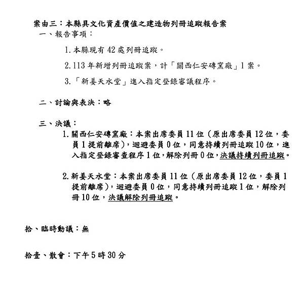 依據:文化資產保存法第18條、歷史建築紀念建築登錄廢止審查及輔助辦法第4、5條暨114年3月18日「新竹縣第三屆古蹟歷史建築紀念建築聚落建築群史蹟及文化景觀審議會第5次會議現場勘查及審議會議」決議事項辦理。