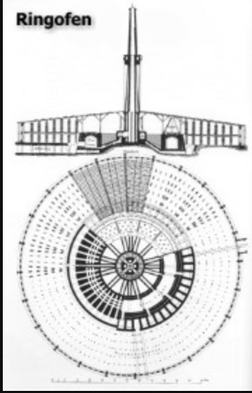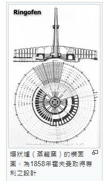 環狀爐(蒸籠窯)的橫面圖,為1858年霍夫曼取得專利之設計