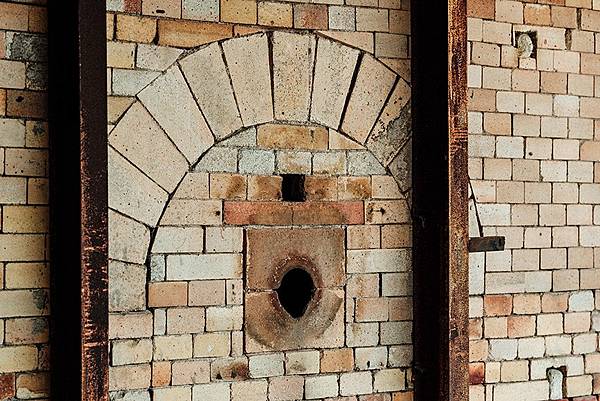 走入倒焰窯內部,半圓空間底下的窯床,布滿矩陣方孔,長年高溫淬煉下的磚造,在微弱光線下反射出黑亮亮的鱗彩。解說人員比劃火焰從左右兩側的火口,沿著火牆向上竄燒至最高處的窯頂,再下沉至窯床,形成「倒焰」的熱對流現象,正是此種窯的特色。而方孔底下是煙道,連接到煙囪排出,「其實我們走的地面下,全都是錯綜複雜的煙道。」