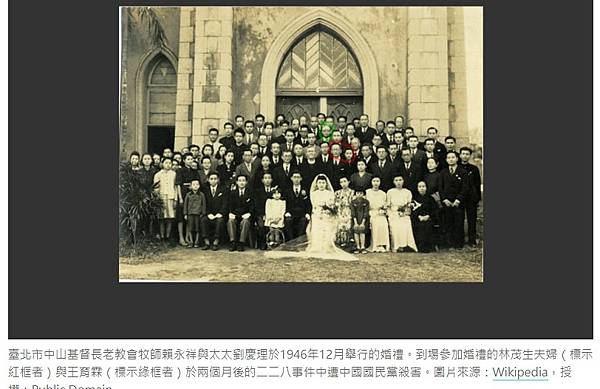 臺北市中山基督長老教會牧師賴永祥與太太劉慶理於1946年12月舉行的婚禮。到場參加婚禮的林茂生夫婦(標示紅框者)與王育霖(標示綠框者)於兩個月後的二二八事件中遭中國國民黨殺害。圖片來源:[Wikipedia](https://zh.wikipedia.org/wiki/林茂生#/media/File:1946-12-26賴永祥與劉慶理在臺灣臺北市中山基督長老教會的婚禮_Wedding_of_Elder_John_Young-hsiang_Lai_and_Ching-Li_Liu_in_Taipei,_TAIWAN.jpg),授權:Public Domain