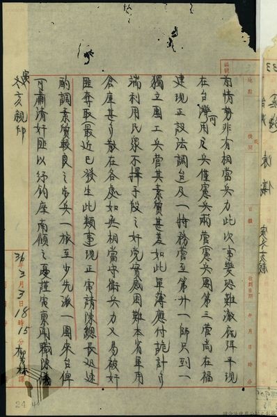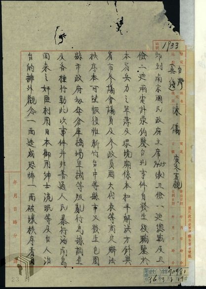 台北事件自發生後,職鑑於本省兵力之單薄及環境關係,本和平解決方針與省市參議會議員及參政員、國大代表等商定辦法,秩序本可望恢復,惟新竹台中等縣市,又發生包圍縣市政府,劫奪倉庫機場軍械等叛亂行為。據調查及各種行動,此次事件并非普通人民暴行,海南島回來之奸匪,利用日本御用紳士流氓等,及台人治台的排外觀念,一面造成恐怖,一面破壞秩序,看目前情勢,非有相當兵力,此次事變恐難澈底弭平。現在台灣可用之兵僅憲兵兩營(憲兵團第三營尚在福建,現正設法調台)及一特務營,至第廿一師只到一獨立團、工兵營,其素質甚差。如此單薄,應付詭計多端、利用民眾不擇手段之奸黨,實感困難。本省軍用倉庫甚多,散在各處,如無相當守衛兵力,又易被奸匪奪取(最近已發生此類事),現正電請陳總長迅速酌調素質較良之步兵一旅,至少先派一團來台,俾可肅清奸匪,以紓鈞座南顧之憂。謹電稟聞。職陳儀寅冬亥親印