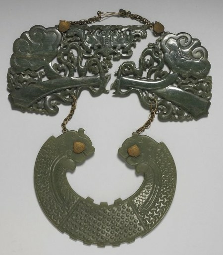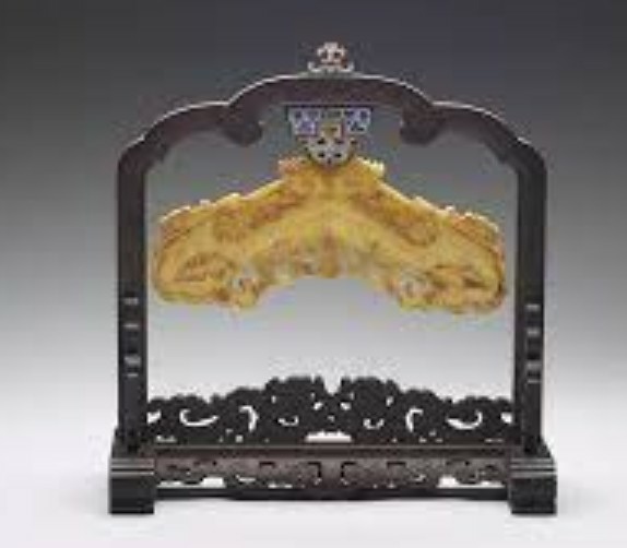 碧玉,分上下兩部份,上半部雕飾鏤空紋飾,中央為一大蝙蝠,下方有二如意首如意交疊,如意延伸至蝙蝠兩側,周圍環繞雲紋及小蝙蝠;下半部為一圓弧形玉片,淺浮雕雙頭龍,龍身兩側飾鎖子紋,中央飾穀紋,上下兩部份以兩條銅鍊串連,上半部玉瓏有兩條銅鍊可吊掛作為玉磬形飾。附木架一只。