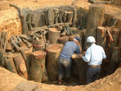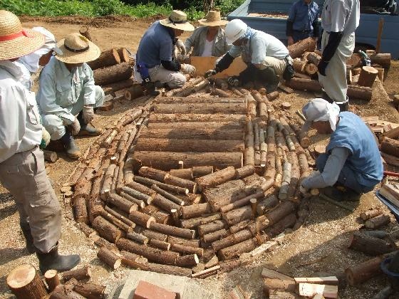 將砍伐下來的樹削去枝葉莖幹,再以密集排列方式豎立於窯內