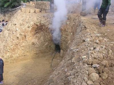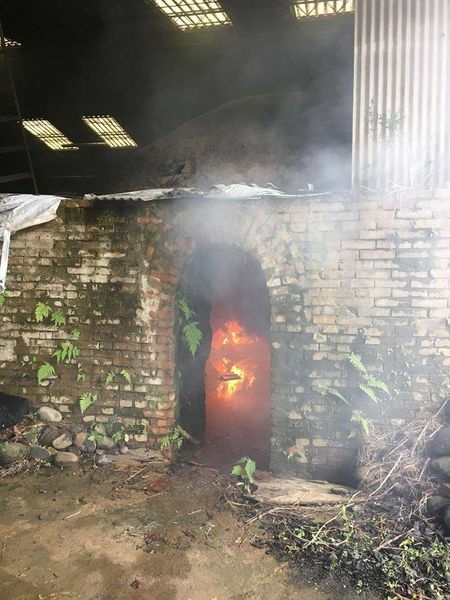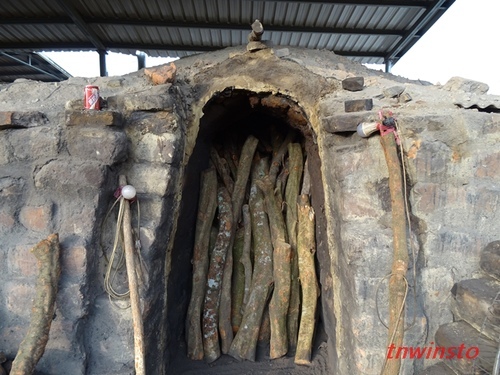出炭口需以磚塊或石頭和著溼泥土混合封住,之後加溫口添柴燒窯,日以繼夜不停的燃燒