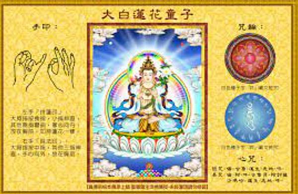 從印度最古老的經典《摩訶婆羅多》就可以考據到大白蓮花童子一稱,香巴拉王朝第一位國王是「文殊師利菩薩」,第二位就是「白蓮花王」。其來歷根源來自「大日如來」,而與「大日如來」在一起的就是「佛眼佛母」,「佛眼佛母」的雙眼化為「摩訶雙蓮池」,而「蓮花童子」即是摩訶雙蓮池的主尊。