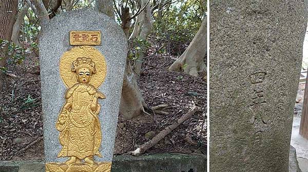 在18號聖觀音石觀音(左圖)的石柱背後,經由時間的風化,那些被刻意抹上的水泥,逐漸脫落,漸漸顯露出的是石柱本身的痕跡,也就是那本應該被保存的「昭和四年八月」的字樣。部分石觀音像後面也還可以找到,17號的千手觀音像背後的字樣就比較淺。
