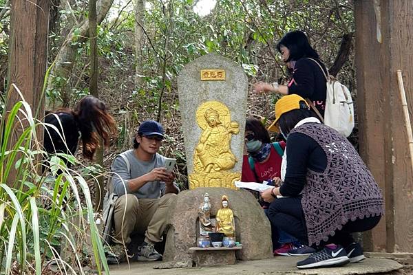 14號石觀音處,大家在向石觀音行敬拜禮之後,繞到後方觀察刻在後方的文字殘跡。(圖片提供:竹塹學-城市老建築觀察,徐銘暉講師側拍,三級警戒前舉辦的活動)