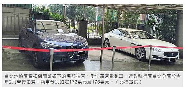 行政執行署台北分署指出,該次拍賣的白色瑪莎拉蒂為2015年6月出廠,排氣量2987cc、里程數1萬7734公里;藍色愛快羅密歐出廠年份為2018年10月,排氣量1995cc,里程數6621公里,兩車引擎發動都正常。